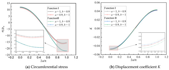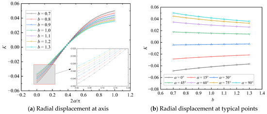 As can be observed from Figure 6a, with the increase in b, the radial displacement at the lining axis decreases, but the deformation trend of the lining is consistent with the maximum displacement at and and the minimum displacement near . In addition, from Figure 6b, with the increase in b, the slope of the radial displacement curve of each typical point decreases gradually. It shows that the increase in a can enhance the stiffness of the lining, but the reduction in deformation becomes smaller and smaller. Comparing Figure 6 with Figure 4, it can be found that the effect of changing a or b alone on the deformation characteristics of functionally gradient lining is the same when other parameters remain unchanged.
