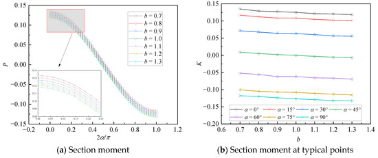From Figure 7a, with the increase in b, the distribution trend of section moment is consistent with the maximum moment at and and the minimum moment near . In addition, from Figure 7b, with the increase in b, the negative section moment at typical points increases linearly, and the positive section moment decreases linearly. The maximum section moment transfers from the section of to the section of , and the maximum section moment decreases. Comparing Figure 7b with Figure 5b, it can be found that with the increase in the section stiffness, the section moment also increases.