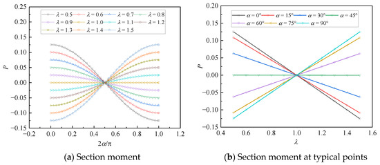 From Figure 8a and Figure 9a, the radial displacement of the lining axis and the section moment are 0 when , which means that when the upper load is equal to the lateral load, the lining is in the safest state. When , the curves of the radial displacement and the section moment are symmetric with the curve of .