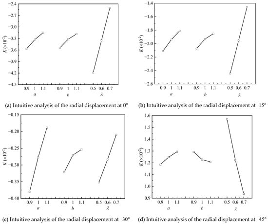 According to Table 5, when , parameters a and have a very significant influence on the radial displacement of the functional gradient lining, and the significance of is greater than that of parameter a. With the increase in , the significance of parameter a on the displacement increases gradually, and that of parameter b on the displacement decreases gradually, but the significance of parameter a is always greater than that of parameter b. When , parameters b and have a very significant influence on the radial displacement of the functional gradient lining, and the significance of is greater than that of parameter b. With the increase in , the significance of parameter a on the displacement increases gradually, and that of parameter b on the displacement decreases gradually, but the significance of parameter b is always greater than that of parameter a. At , parameters a and b have no effect on the radial displacement, but has a significant effect on the radial displacement.