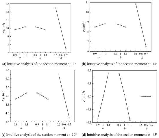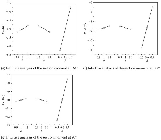 According to the variance analysis in Table 7, the influence of on the section moment is very significant, and the influence on the positions of and is the most significant. The influence of elastic modulus parameters a and b on the section moment is significant, and the significant degree is similar. The section of is abnormal in the variance analysis, where has no effect on the section moment, and the influence of the elastic modulus parameters on the section moment is similar to that of other parts. Because of the small section moment, this abnormality is not considered.