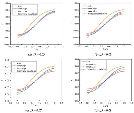 From Figure 12, it can be observed that the radial displacement at the inner edge of the cylinder is the largest, followed by the axis, and the outer edge is the smallest, indicating that the inner edge of the cylinder structure should be used as the basis for failure under the action of external force. When , the theoretical calculation results are close to the radial displacement of the inner edge of the cylinder in the numerical simulation results. With the increase in the thickness diameter ratio, the numerical simulation results of the radial displacement of the inner edge at and gradually increase. When , the numerical simulation results of the radial displacement of the inner edge at and are closest to the theoretical calculation results. However, when , the numerical simulation results of the radial displacement of the inner edge at and exceed the theoretical calculation results, and the gap between them gradually becomes larger. It shows that when , the theoretical calculation results can be used to calculate the radial displacement of the inner edge, and the calculation results are conservative. However, when , if the theoretical model continues to be applied to calculate the radial displacement at the most unfavorable position, the results will be smaller, which is not conducive to the safety of the structure. In conclusion, the theoretical model of internal force and deformation is suitable for the cylinder structure.