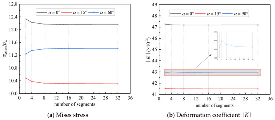 Because ABAQUS 6.14 cannot realize the continuous change in the elastic modulus along the circular direction, the cylinder structure is adopted to give the elastic modulus along the circular direction in sections. When there are enough segments, it can be considered that the cylinder with segments given the elastic modulus is equivalent to the functional gradient cylinder in mechanical properties. Next, the number of segments is explored. The change trend of Mises stress and deformation coefficient |K| with the number of segments at typical points is shown in Figure 13.