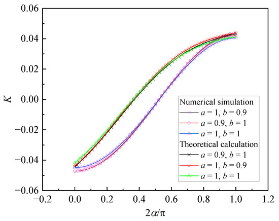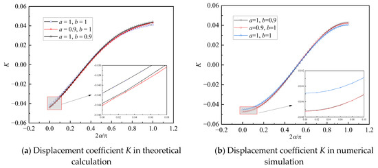Based on the above demonstration of the thickness diameter ratio and the number of segments of the functional gradient cylinder in the numerical simulation, the mechanical properties of functional gradient linings with and the number of segments of 16 are analyzed, and the deformation coefficient K of the functional gradient lining under the condition of the elastic modulus Function I is compared with the theoretical calculation result, and the comparison result is shown in Figure 14. The radial displacement of FGM lining with different elastic modulus parameters in the theoretical calculation and numerical simulation is shown in Figure 15. Compared with the radial displacement of FGM linings with two elastic modulus functions, the result is shown in Figure 16.