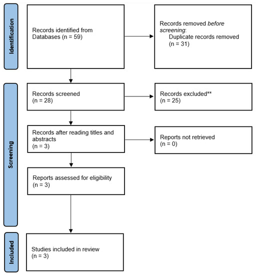 The initial database searches revealed 59 studies; after removal of the duplicates (n = 31), 28 studies remained. After reading the titles and the abstracts, three articles were selected for full-text screening based on the inclusion criteria, and were ultimately included in the present study. No additional articles were identified using bibliographic or manual searches. Among the included studies, two studies evaluated the effectiveness of using 10% carbamide peroxide using Invisalign [35,36]; in both studies, patients were asked to bleach their teeth for 8 h. However, the duration differed from 10 days in one study [35] to 4 weeks in the other [36]. On the other hand, the third study [37] assessed the effectiveness of tooth bleaching using F22 clear aligners. In this study [37], different concentrations of carbamide and hydrogen peroxides, as well as different durations of bleaching (1 or 2 weeks), were assessed.