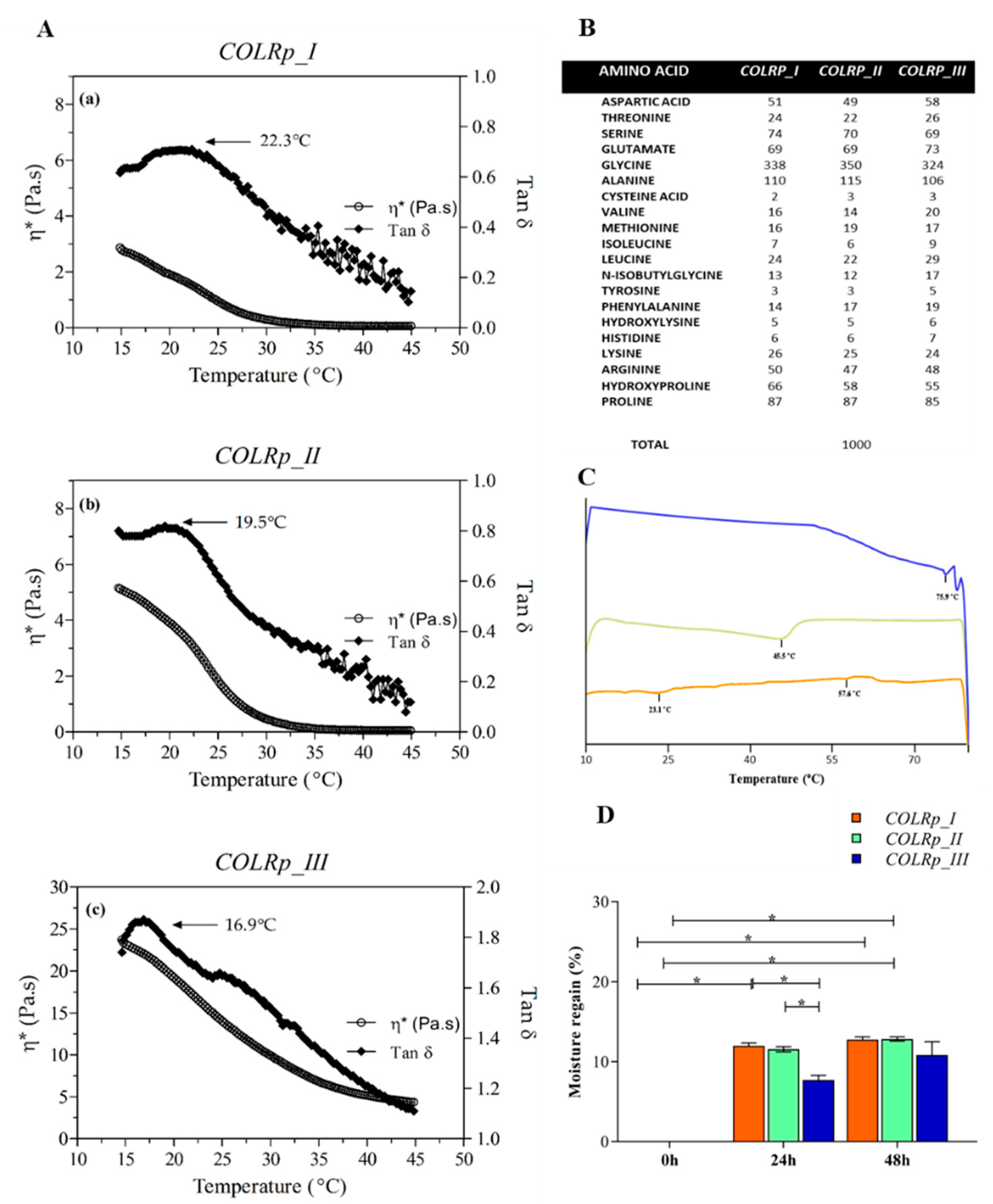 - Sorushanova, A.; Skoufos, I.; Tzora, A.; Mullen, A.M.; Zeugolis, D.I. The influence of animal species, gender and tissue on the structural, biophysical, biochemical and biological properties of collagen sponges. J. Mater. Sci. Mater. Med. 2021, 32, 1–12. [Google Scholar] [CrossRef] [PubMed]