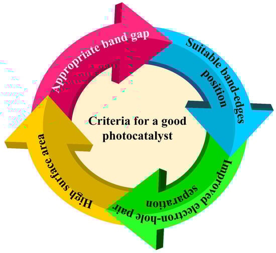 With rapid urban and societal development, environmental problems, such as organic contaminants, pathogenic micro-organisms, heavy metal ion effluence and energy demands, have posed serious threats to the sustainable growth of human life [1,2]. Predominantly, wastewater is the key source of water pollution, occurring particularly from chemical industrialization, which is carcinogenic and enormously poisonous in nature due to the presence of extensive large organic complexes [3]. The conventionally utilized environmental remediation processes, such as chemical oxidation, adsorption, incineration, and biological oxidation, have been employed in the mitigation of all types of toxic and organic water contaminants [4,5,6,7]. However, the performance of these techniques is not effective, owing to an incomplete degradation of the persistent organic pollutants and noxious sludge formation [7,8,9]. Solar light-driven photocatalytic technologies offer a prominent strategy to resolve worldwide environmental issues [10,11,12]. As a novel approach to beneficiate solar energy, semiconductor-based photocatalysis provides a sustainable and environmentally friendly technology, compared to chemical and biological techniques [13]. Since the 1970s, TiO2 has been found as an outstanding semiconducting material by Fujishima and Honda [14]. Carey and co-workers studied the photocatalytic degradation ability of the TiO2 towards organic toxins in the aqueous solution, which increased the interest of researchers on TiO2 photocatalysis [15,16,17]. Thereafter, a number of semiconductors photocatalysts, involving TiO2 [18], SrTiO3 [19,20], black phosphorus [21], ZnO [20,22,23], and Bi2MO6 [24], have been fabricated and broadly studied with the application in organic pollutants photodegradation [25,26], H2 evolution [27], and CO2 reduction into solar fuels [28,29]. Additionally, Malato et al. summarized the research related to the solar light-assisted photodegradation of persistent water pollutants through the generation of •OH free radicals [30]. However, a potential semiconductor photocatalyst should have characteristic features, including suitable band-edges positions, appropriate band energy, high surface area, and more electron-hole pair separation and mobility as delineated in (Figure 1) [31]. These desirable features, such as high surface area due to the formation of nanoparticles, leading to high adsorption, efficient charge separation due to preferential migration along a certain direction, and suitable band-positioning, fulfilling the requirement of •OH, •O2− free radicals [32,33].