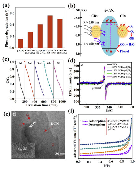The fast-growing urbanization and agricultural industries have led to inevitable discharge of the large quantity of hazardous, toxic, and interminably pollutants into the natural environment. Hence, with the goal of conserving the environment and apprehending the sustainable advances of human life, the photodegradation of pollutants is a research focus worldwide. In this regard, g-C3N4/CQDs-based nanocomposites, as novel heterogeneous photocatalysts, have recently attained great research attention due to their potential application in the eradication of a wide-range of contaminants [58,59]. For instance, Fang and co-workers studied the photocatalytic performance of CQDs-decorated g-C3N4, synthesized by a novel method using CQDs and dicyandiamide as chemicals, employed for rhodamine B (RhB) elimination in the presence of the UV light region [60]. This study demonstrated the photoactivity of g-C3N4/CQDs nanocomposite (0.013 moL−1min−1) to be three times greater than bare g-C3N4 (0.0044 moL−1min−1). In another piece of research, Zhang and his peer group combined g-C3N4 with distinct mole fractions of CQDs to evaluate the photocatalytic activity for photodegradation of phenol under visible-light irradiation [61]. The nanocomposite was prepared through feasible impregnation thermal technique and composite containing 0.5 wt% of CQDs, displaying a 3.7 times higher rate constant with best photodegradation ability than bare g-C3N4 (Figure 4a). The proposed mechanism of the g-C3N4/CQDs nanocomposites under visible-light illumination were delineated in (Figure 4b). The up-conversion photoluminescent (UCPL) properties of CQDs enabled the conversion of longer wavelengths into smaller wavelengths (λ = 460 nm), resulting in photo-excitation of charge pairs by g-C3N4. Subsequently, the matched band configuration imitates electrons migration from CB of g-C3N4 to CQDs, giving maximum charge carrier separation. Importantly, the photostability of the g-C3N4/CQDs nanocomposite was also significantly bettered wherein the photocatalytic performance of the photocatalyst endured up to five successive consecutive cycles under light illuminations (Figure 4c). Additionally, a g-C3N4/CQDs nanocomposite was fabricated through a simple hydrothermal approach and displayed outstanding degradation activity of 71.53% towards 2,4-dichlorophenol, 1.5-fold greater than bare g-C3N4 [62]. Henceforth, from the above discussion it can be concluded that the best efficacy of the photocatalyst was attributed to CQDs, which acted as electron sinks and hamper the recombination of charge pairs with enhanced separation rate. In addition, UV-visible diffuse reflectance spectrum (UV-vis DRS) analysis detected CQDs as photosensitizers for g-C3N4, enabling wider-range light harvesting of solar light. This broad-spectrum absorption generates more electrons for the enhancement of photocatalytic performance.