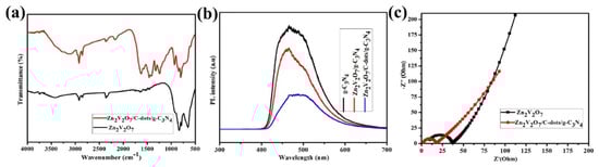 (a) Fourier transform infrared spectrum, (b) time-resolved photoluminescence analysis, and (c) electron impedance spectroscopy of Zn2V2O7/CQDs/g-C3N4 hybrid and Zn2V2O7. Reproduced with permission from Ref. [65] Copyright Springer 2019.