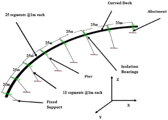 A horizontally curved reinforced concrete bridge (Figure 2) (with a radius of curvature of 315 m) has been considered for the study (Li Yu et al.) [29]. The bridge consists of 7 spans that comprise 5 intermediate sections of 25 m in length and a final section of 20 m. The total length of the bridge is 165 m. The superstructure consists of a single chamber box girder of a constant section with an area of 3.099 m2 and a longitudinal bending moment of inertia of 0.599 m4. M40-grade concrete has been considered. All the piers are made of M30 grade concrete, with a height of 11 m and a circular cross-sectional area of 1.767 m2. Spiral reinforcement (20 Φ) is used as stirrups with a pitch of 10 cm, and longitudinal reinforcement bars of 15 nos. 28 Φ are used together with a cover layer thickness of 5 cm. The bridge was modeled using the finite element program in SAP2000 [30] software. The bridge superstructure and piers were modeled using beam elements, and masses were concentrated at discrete points.