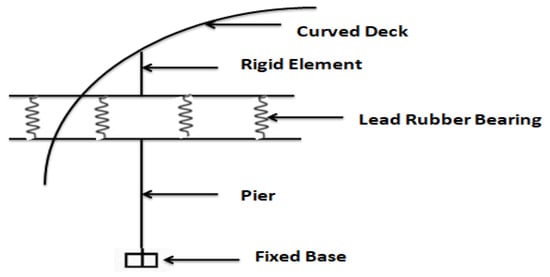 The piers are considered to be fixed as they are considered to be resting on the rock. The abutment is assumed to be rigid. LRBs have been modeled as link elements (Figure 3). The force-deformation behavior of LRB is shown in Figure 4a,b. The bridge is supported by roller bearings at the abutment and fixed to the bottom of the pier. For each case, two LRBs are considered at each abutment location, and four LRBs are considered at each pier location. In the model, the global longitudinal (X) axis is the straight line connecting two abutments, and the global transverse (Y) axis is the perpendicular horizontal direction with respect to the X axis. The vertical axis is the global Z direction.