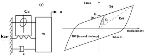 The Bouc–Wen model [33] was used in this study and is shown in Figure 4. The model is presented by three parameters: (a) Post Yield Stiffness ratio or ; (b) Characteristic strength inter concept of zero displacements; (c) Yield strength . The Characteristic Strength of LRB is provided by the yield strength of lead in shear and cross-sectional area of the lead plug , as given by the following equation.