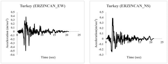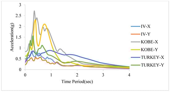 Three recorded ground motions from the PEER Strong Earthquake Database (PEER 2014) [48] have been considered without scaling viz. (1) Imperial Valley (1940), with perpendicular components (PGA 0.313 g and PGA 0.215 g), (2) Kobe (1995), with two earthquake components (PGA 0.83 g and PGA 0.63 g), and (3) Turkey (1992), as indicated in Table 2 and Figure 5. Figure 6 shows the response spectrum curve considered in the study. The conditions close to far-field, near-field, and forward directivity effects, respectively, were represented by the selected ground motions.