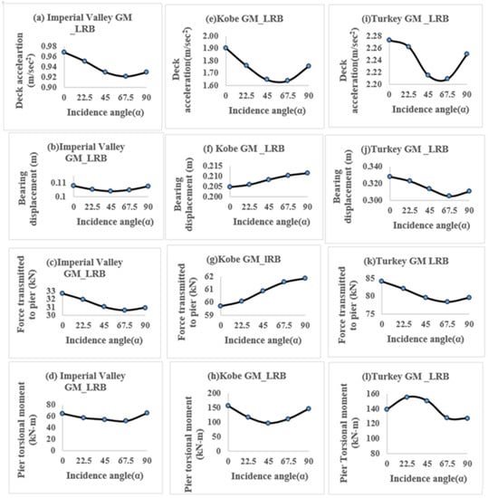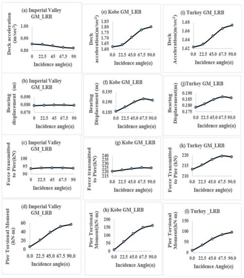 The earthquake’s incident angle (α) is an important consideration because the bridge is of a curved configuration and the contribution of responses from both horizontal directions is vital for the bearing design. This study considered the key response parameters, such as deck acceleration, bearing displacement, force transmitted to the pier, and pier torsional moment.