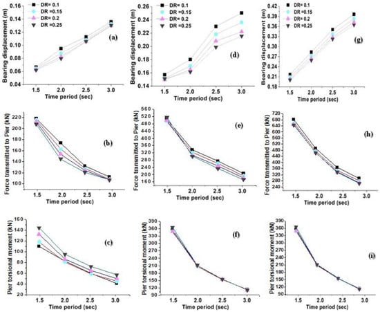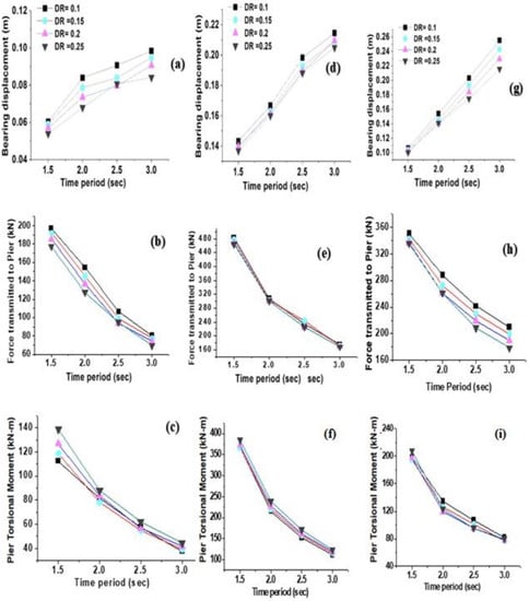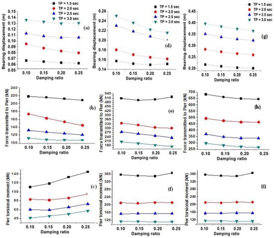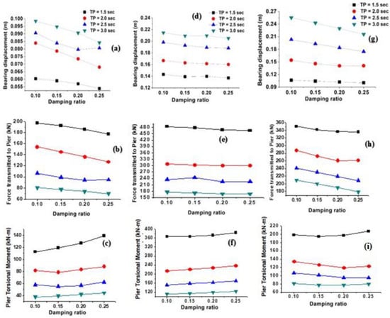 Figure 10a–i show the variation of the bridge response for variation of the time period with all considered damping ratios for uni-directional Imperial Valley, Kobe, and Turkey earthquakes, respectively. It was found that with respect to the time period, the response parameters are more sensitive for all the considered damping ratios.
