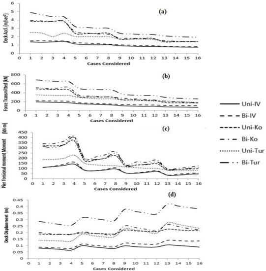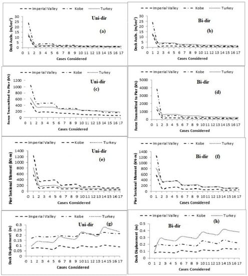 However, in the case of Turkey ground motion, the reduction of the maximum deck acceleration and force transmitted to the pier and pier torsional moment was less, around 80–89%, 44–71%, and 75–90%, respectively, for uni-directional motion and 62–85%, 56–83%, and 53–85%, respectively, for bi-directional motion.