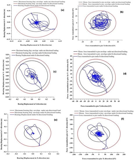 Figure 15 represents the envelope (corresponding to a 2.5 s time period and 20% damping ratio) of bearing displacement and force transmitted to the pier for Imperial Valley, Kobe, and Turkey earthquake motions. It was noticed that the bi-directional response envelope (red line) surpassed the uni-directional envelope (black line) by a substantial amount. A similar response was observed by Gupta et al. [49,50,51]. This fact is very important for the design of isolated bridge structures as, in the traditional manner only the principal horizontal direction was considered. However, for actual consideration, the design should have been governed by the response contribution considering bi-directional loading. In Figure 15, the blue line represents the time history response due to bi-directional loading. As the red line has exceeded both the blue and black lines, the dominance of the response of the bridge structure to the bi-directional motion has been well established.