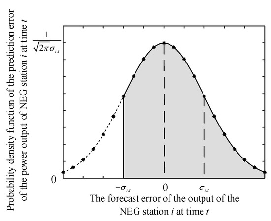 Define the prediction error of the power output of the REG station i at time t as . The probability density function of the predicted REG power error of the REG station i at moment t is . From the historical forecasting information of the REG stations, the forecast errors of the REG station output are basically normally distributed.