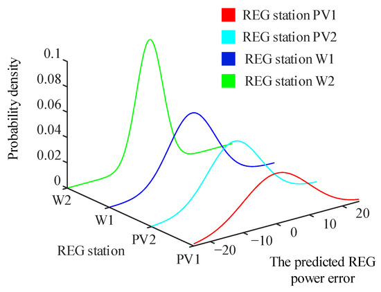 According to the prediction error model of each REG station (detailed data is in Appendix A), the probability density function of the predicted REG power error was obtained, as shown in Figure 6.