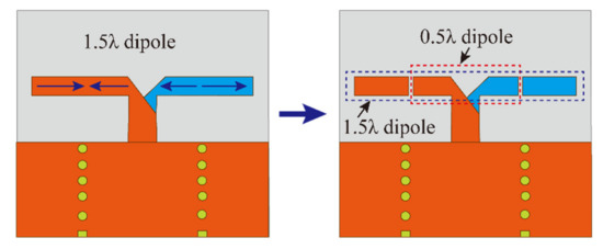 Compared with the conventional SIW-fed dipole antenna [8,9,10], the proposed folded dipole antenna achieves a wide operating bandwidth owing to dual mode resonance. For a dipole antenna whose diameter is much smaller than the wavelength, current flowing in the arms of dipole has a sinusoidal standing wave pattern with a null at the end. Figure 2 shows the current distribution corresponding to dipoles with different arm lengths. For 0.5λ dipole, the currents have the same phase and amplitude in the two arms and the input impedance of 0.5λ dipole mode is about 73 Ω. For 1.5λ dipole, there is opposite-phase currents on the arms at the same time and two current zeros located at ±λ/4 can be observed. The input impedance of the 1.5λ dipole is calculated as 103 Ω. The input impedance of the two dipoles with different lengths is very close. Thus, if two gaps are cut at the zero current positions of 1.5λ dipole to ensure that the current distribution of 1.5λ higher-order dipole mode is not destroyed, it is possible to achieve functionality in the 0.5λ dipole mode and the 1.5λ dipole mode.