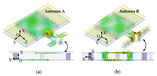 Figure 6 shows the surface currents for the conventional SIW-fed dipole (Antenna A) and the presented SIW-fed folded dipole (Antenna B) at 45 GHz. The aperture of the SIW terminal is equivalent to a magnetic dipole [19] aligning with the y-axis, and it mainly contributes to the vertical polarization electric field while the printed electric dipole mainly contributes to the horizontal polarization electric field, as shown in Figure 6a. Therefore, the conventional SIW-fed dipole has a poor cross-polarization higher than −13 dB. However, for the SIW-fed folded dipole antenna, it can be observed from Figure 4b that the surface of the connecting metallic vias have a current in vertical direction and the currents have the same phase and amplitude. Therefore, the vertical polarization electric field of the SIW-fed folded dipole comes from two parts: one is the magnetic dipole and the other is the surface currents on the surface of the connecting metallic vias. If the two vertical polarization electric fields are adjusted with the out-of-phase, the cross-polarization of the SIW-fed folded dipole will be improved.