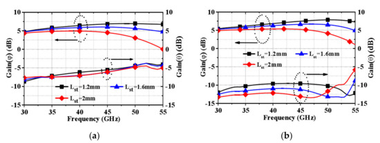 The orthogonal gain components Gain(θ) and Gain(φ) of Antenna A and the proposed Antenna B for various Lst are shown in Figure 8a,b, respectively. For Antenna A, as the length Lst of the DSPSL increases, the amplitude of Gain(φ) will be reduced, while the amplitude of Gain(θ) only has a small change. A similar change can be observed for the Gain(φ) of Antenna B with that of Antenna A. However, the amplitude of the Gain(θ) can be effectively reduced by adjusting the length of DSPSL; the proposed antenna can achieve a lower cross-polarization than the conventional SIW-fed dipole antenna.