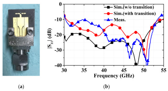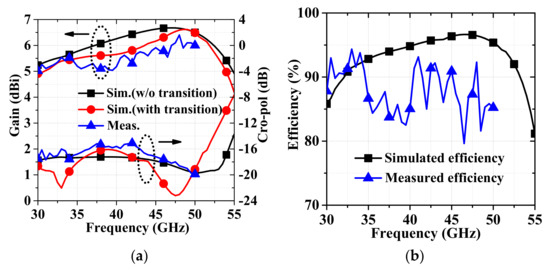 A wideband SIW-to-CPW transition is designed for measurement [21]. A prototype of the proposed antenna is fabricated using the single-layer printed circuit board (PCB) process, and the photograph is exhibited in Figure 9a. The optimized configuration is given in Table 1. The simulated and measured reflection coefficients are displayed in Figure 9b. It can be observed that the working bandwidth of proposed planar folded dipole is 55.7% (from 30.3 to 53.7 GHz), and the simulated and measured results are in good agreement. The measured gain and the cross-polarization are presented in Figure 10a and the simulated results are compared. The measured gain is between 5.1 and 6.4 dBi within the operating band. The maximum gain variation is less than 1.3 dBi. The measured cross-polarization levels are below −15 dB over the working band. It is worth noting that it is possible to make a design with a better cross-polarization at the expense of the antenna gain. Here, we make a compromise that the proposed antenna has a moderately high gain and a relatively low cross-polarization over the operating band. The simulated and the measured efficiency are also presented in Figure 10b; the measured efficiency is larger than 80%.
