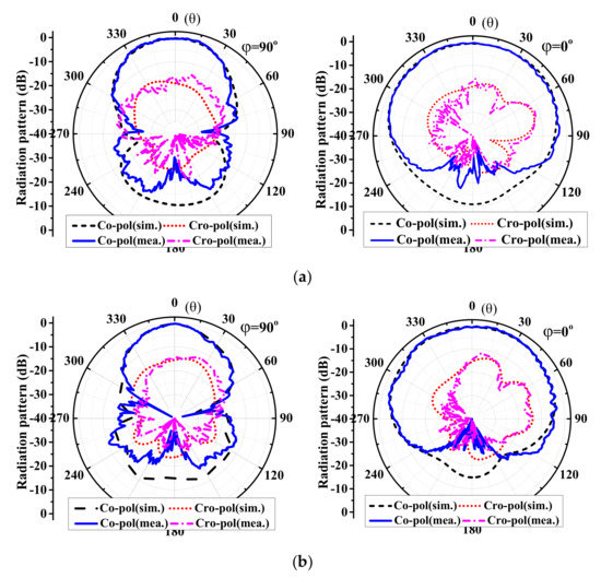 The radiation patterns in the yoz-plane and the xoz-plane for 35 and 45 GHz are shown in Figure 11a,b, respectively. Stable endfire radiation patterns are obtained and the measured radiation patterns well agree with the simulated ones. However, the cross-polarization patterns are asymmetric in the xoz-plane, which was probably caused by the SIW-to-CPW transition. The slots of the transition are distributed at one side of the substrate; it is expected to produce some leakage which make the cross-polarization patterns asymmetrical in the xoz-plane.