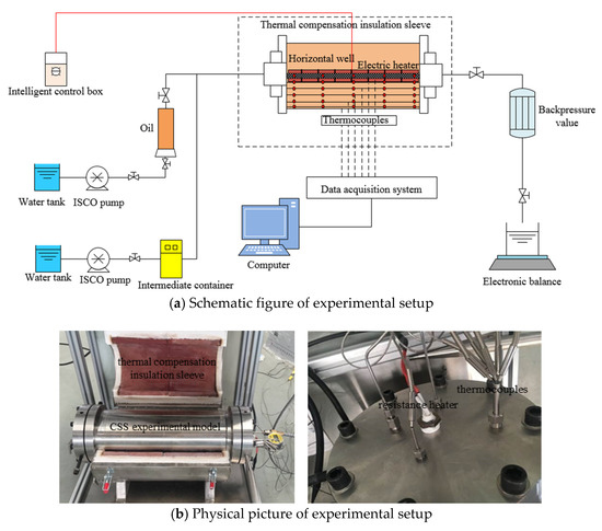 There have been some previous studies on the effects of E-CSS. Some studies indicate that electric heating reduces the viscosity near the wellbore area, increases the bottom hole pressure, and avoids the excessive release of gas near the wellbore area [10,11]. For high-temperature and high-power electric heating technology in heavy oil wells, high power electric heating rapidly heats up the reservoir, produces micro fractures, and greatly improves porous flow capacity and oil production [12,13]. Moreover, distributed electric heating can increase the average oil recovery rate by 30–50% and prolong the production cycle obviously [14]. Electric heating is feasible technologically and economically [15]. However, the previous research has mainly focused on downhole resistance heating to improve the uniform preheating effects of SAGD in the start-up phase, as well as the degree of usage of the horizontal section of SAGD and the scale of steam chamber development in the production phase [16,17,18,19,20]. Relevant research has not yet been carried out on the usage of E-CSS for the horizontal well. This paper suggests installing a high-energy, long-lasting and high-power resistance electrical heater into the horizontal section of the horizontal wells (the power is greater than 1000 W/m, the heating surface temperature reaches 300 °C, and the continuous heating time is more than 5 years), which allows for an improvement in steam enthalpy, reducing the flow resistance to wells. The use of high-temperature electric heating in the horizontal section supports promotion of the acceleration of the low-permeability sections and the middle and back sections of the horizontal wells, so as to increase production levels in the horizontal section and recovery. In this paper, the mathematical model of the E-CSS of horizontal wells was deduced and established, and physical simulation experiments for the E-CSS of horizontal wells were carried out. In addition, numerical simulation of the performance prediction for the E-CSS of horizontal wells was also conducted. The key enhance-oil-recovery mechanism of electric heating was revealed and validated. The application effects of E-CSS and conventional CSS were compared and analyzed. Moreover, the application potential of E-CSS was recognized and summarized.