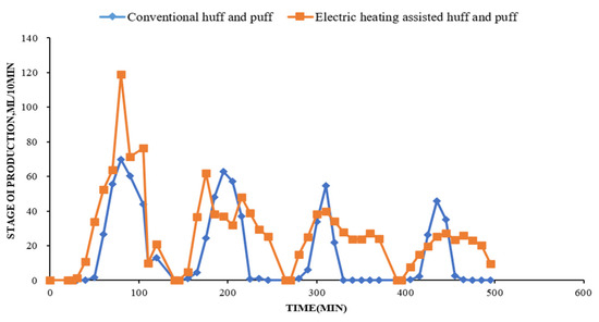 Figure 8 shows the comparison of the oil production rate for conventional CSS and E-CSS. From Figure 8, the comparison of oil production speeds shows that conventional CSS had a rapid decline in production during the production phase, while the use of electric heating effectively slowed down the decline in production. The statistics of four cycles of conventional CSS were 281 mL, 237 mL, 118 mL, 113 mL, and the total oil production was 749 mL; that of E-CSS was 460 mL, 253 mL, 280 mL, and 197 mL, a total of 1290 mL. The average cycle oil increase was more than 50% and the enhanced oil recovery effect was obvious.