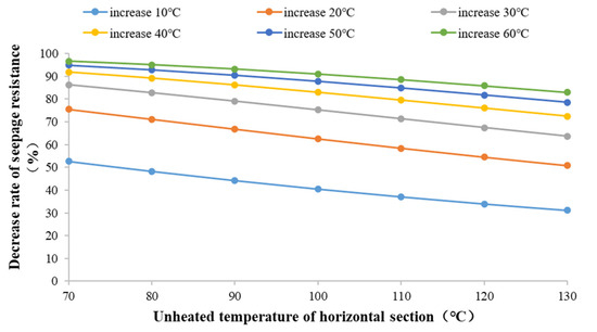 The formula above simplifies the decrease rate of porous flow resistance 5 in the near-well area of CSS to a function of temperature . According to that formula, the graph of the decline rate of porous flow resistance in the well is calculated under different temperature conditions of the conventional CSS level horizontal section and different heating amplitude of electric heating.