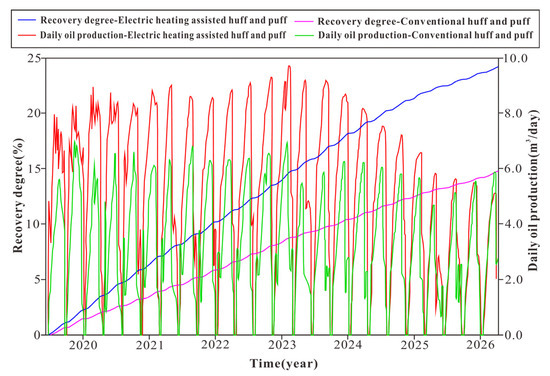 Figure 10 shows the comparison of the oil rate and oil recovery factor for CSS and E-CSS. From Figure 10, this comparison indicates that during the E-CSS process, the oil layer temperature in the near-well area continues to heat up, and the flow resistance of the horizontal section into the well is significantly reduced; the oil increase in the CSS cycle becomes more and more obvious. By the 13th round, the peak of oil increase is reached, and then gradually decreased. After the 20th round, electric heating assistance has no obvious effect. The reason is that the formation thermal field near the wellbore area in the late stage of multi-cycle CSS has been established, and there is no obvious effect in continuing electric heating to heat up the near-well area. According to the statistics, the recovery of the 20 cycles of E-CSS is 9.4%, which is higher than that of conventional CSS, and the cumulative oil–steam ratio has increased from 0.14 of conventional CSS to 0.23, indicating that electric heating can greatly increase the CSS; the oil–steam ratio and the recovery factor have important potential for improving the CSS of horizontal wells.