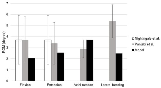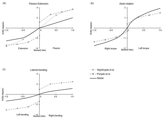 The accuracy of the developed model was validated by comparing output predictions with previously published experimental data. The results for flexion and extension were compared with the studies from Nightingale et al. [35] and Panjabi et al. [34]; the results for axial rotation and lateral bending were compared only with the study from Panjabi et al. [34].
