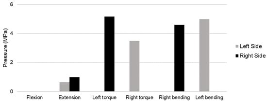 From the above analysis of the simulation results, it is possible to observe that the ligaments and facet joints play a major role in limiting movement, as was expected. Furthermore, the role of the facet joints in limiting the ROM is more pronounced in axial rotation and lateral bending, as evidenced by the higher pressures registered during these movements (Figure 5).