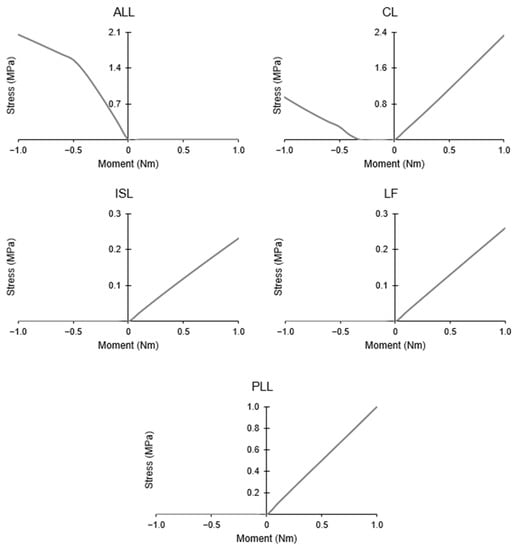 In axial rotation, all ligaments are activated regardless of rotation direction. This can be seen in Figure 8, where they all produce stress with either left or right torque. For the most part, the ligaments respond symmetrically to axial rotation, with the exception of the LF, which shows lower stress with right torque. This may be a result of the placement of the ligament or the original orientation of the spine.