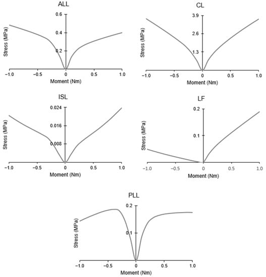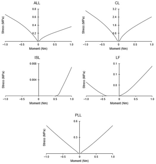 The ligaments are fundamental in the definition of the cervical spine’s ROM. They act primarily in tension, and as such develop stresses when stretched, which varies according to the moment applied. Therefore, certain ligaments contribute more to withstanding certain loads because of their location. The ALL is one example; it is not active during flexion, and produces stress during extension. The opposite occurs in the PLL, ISL, and LF, while the CL is active during both motions. Figure 7 shows the maximum stress registered by the ligaments during flexion–extension.