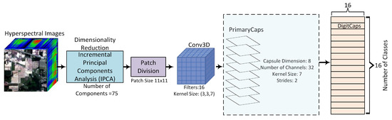 As demonstrated in Figure 2, in the proposed framework, the hyperspectral images are passed by IPCA to reduce the dimension and keep important information only. After this, the image is divided into 11 × 11 patches, which undergo a 3D convolution layer to extract shallow features. These extracted features are used by Capsule-Net to get classification done. The details regarding IPCA and Capsule-Net are discussed below.
