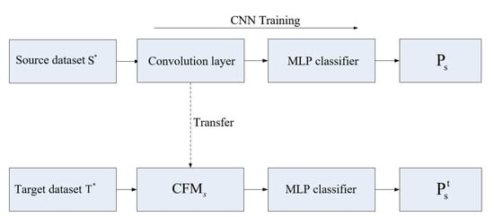 The convolution neural network trained on the source dataset  can be simply divided into two parts: the convolutional layer used to extract the feature and the MLP layer as the classifier. The convolutional network is fully trained on the source dataset until it converged, and the convolutional layer migrates as the CFM of the target set. As shown in Figure 1, after the source dataset  is trained by the convolutional network and the MLP layer, the corresponding classification accuracy  is obtained, the feature mapper corresponding to the source dataset  of the s class is , and the target dataset  of the t class is passed through the . The features are extracted, and then classification training is performed with the MLP classifier, and the corresponding accuracy  is obtained
