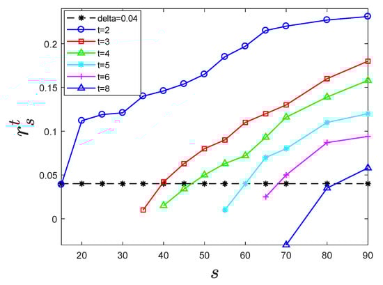 As shown in Figure 2, it can be seen that for the determined t categories from target dataset , the value of  was positively correlated with s: as the corresponding s of the  increased,  increased monotonously. That is, for a certain target dataset with t categories, the larger the value of s was, the better the generalization ability of the  trained by the source dataset . For a  trained on the determined s source dataset , the value of  was negatively correlated with  and with the number of t categories in the target dataset;  decreased monotonously as t increased. That is, for a  that determined the number of categories, a target dataset  with a smaller number of t had a better the generalization ability than a target dataset with larger values of t. When  was a certain value, that is, after the feature was extracted under the  for t different categories, and the magnitude of the classification promotion was the same, the number of  for different values of t corresponding to s was different.