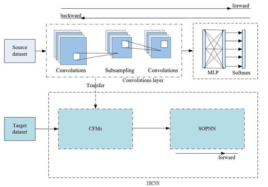 The network structure of the GHP-CNN in this paper is shown in Figure 5. The GHP-CNN mainly consists of three steps in the training process. First, the CNN is adequately trained with the source data. The source data information is propagated forward and backward until the CNN converges. Second, the parameters of the convolutional layer can be obtained in the first step of training, and the convolutional layer with fixed parameters is transferred as a separate  to extract the image features of the training samples in the target set. Third, the SOPNN is trained on the target dataset. The image features of the target training set are input into the SOPNN for training, and a well-trained SOPNN classifier can be obtained. SOPNN training only requires forward propagation once and does not require backpropagation. After completing the above three steps, we obtain the trained GHP-CNN network. If the test image in the target dataset is input directly into the CFM, then the SOPNN classifier in the GHP-CNN can be used for target classification. The proposed GHP-CNN has the following three characteristics.