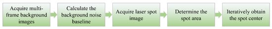 An optical system that consists of a laser, laser attenuator, lens, and CCD camera was built to collect the laser spot image (Figure 1). The realization of spot center detection is shown in Figure 2. To eliminate the influence of noise on the laser spot, the method is divided into two steps. The first step is to calculate the background noise baseline using multi-frame background images acquired by the CCD, and the other locates the center of the laser spot after removing noise.