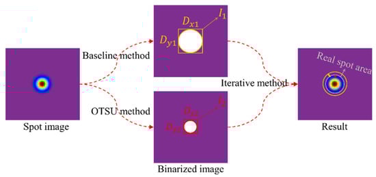 In accordance with the definition of ISO standards, the laser spot centroid and beam width can be calculated using the first-order moment and the second-order moment, respectively [22]. Our method makes improvements on this basis to search for the effective spot area iteratively under the premise of eliminating background noise effectively to enable a more precise computation of spot center.