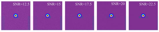 As shown in Figure 5, MATLAB was used for simulation to generate ideal laser spot images with the radius of 20 pixels on the center of a size of 256 × 256 pixels. The central position was (128, 128). The CCD camera’s own noise has a large impact on the image of the laser spot. In order to simulate a noisy environment, random noise was added to the laser spot image using a given signal-to-noise ratio (SNR) according to the random noise characteristics of the CCD. As shown in Figure 6, to imitate the real environment and to verify the feasibility of the method in this paper, we added random noise with different SNRs to the laser spot images, which reflect the changes in the images from low to high SNRs. We generate 10 background noise images for each of the different SNRs, and then an optimal baseline value is calculated using the statistical method of background noise baseline proposed in this paper, which makes it possible to effectively filter out the background noise in the spot image while retaining the true spot information of the laser as much as possible. After the effective elimination of background noise, the threshold value of the difference between the radii of the two spot areas is set , iterative area shrinkage is performed based on the difference between the radii of the two newly obtained spot areas, and the real spot area is located until the end-of-iteration condition is satisfied, allowing the center of the spot to be calculated.