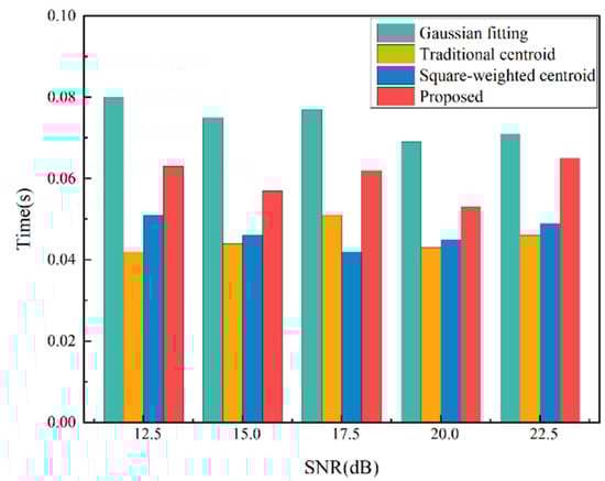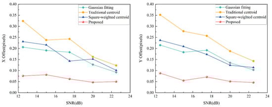 As shown in Figure 7, the method proposed in this paper and some popular algorithms were used to compare the deviation of the detected spot center from the true spot center after the corresponding denoising of the spot image. With the gradual increase in image SNR, the deviation between the detected spot center and the real spot center determined using the Gaussian fitting algorithm, traditional centroid method, and square-weighted centroid method decreases rapidly, and the center localization accuracy improves. However, these methods are easily affected by background noise. The deviation between the center positioning results of x-axis and y-axis and the true center is more than 0.2 pixels when the interference from background noise is large (SNR = 12.5), and the fluctuation range of the center positioning results is larger as the SNR of the image increases. In contrast, the method proposed in this paper could find the center of the laser spot accurately under the interference of background noise, with the maximum centering accuracy reaching 0.05 pixels, and the deviation of the spot centering results fluctuated slightly.