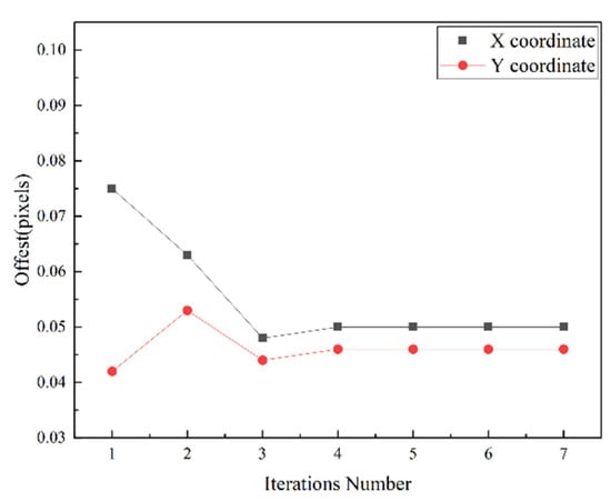 The iterative convergence of the spot area in this paper is shown in Figure 8. The spot area stabilized at the third–fourth iterations, and the final spot center was calculated. Figure 9 shows the comparison of the running time of different algorithms. Although the computational complexity of this paper’s algorithm is higher than that of the traditional and square-weighted centroid methods, our algorithm was less complex than that of the Gaussian fitting algorithm, and our average running time was 0.061 s, thus meeting the real-time requirement. Therefore, the positioning accuracy and running efficiency of the spot center localization method in this paper could obtain better results.
