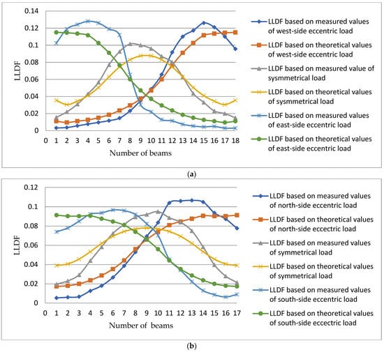 After obtaining by solving Equation (7c), the lateral load distribution factor of each beam can be obtained by Equation (9a–c). of is the number of the beam for which LLDF is being calculated, and of is the number of the beam loaded by external load .