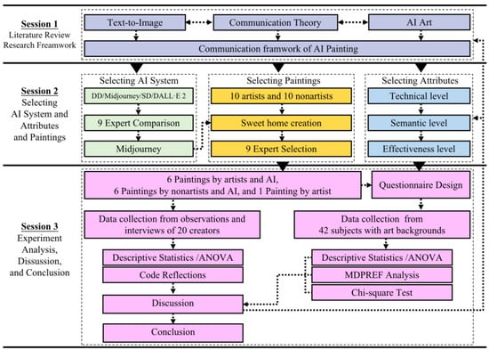 This research aimed to analyze and understand how text-to-image technology affects art creation and appreciation. Additionally, the main discussion focused on the difference in activities and results between artists and nonartists from the perspective of art communication. Figure 1 shows that this study could be divided into three sections. In Section 1, a literature review was made to explore the research framework of the generation mechanism of visual art collaboration with AI. In Section 2, nine experts with artistic and/or aesthetic backgrounds were invited to select a suitable AI system and painting samples according to their art appreciation. In Section 3, the data were collected from the creators of the samples and from the subjects participating in the questionnaire for analysis and discussion. Finally, the conclusions of this study were given.