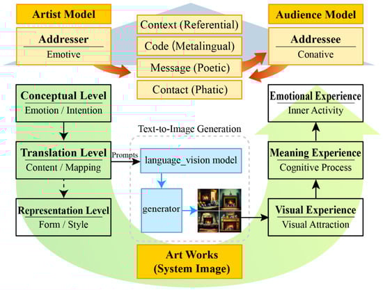 According to communication theory, the process of artist expression is called encoding, and the way the artwork is perceived by the audience is regarded as decoding [,]. Jakobson proposed six constitutive factors with six functions in communication: the addresser, addressee, context, message, contact, and code []. For example, an artist (addresser) sends a message to an audience (addressee) through his/her painting. The artist’s work, as the message with a story (context), plays a role in the connection between himself/herself and the audience (contact). Finally, his/her message must be based on a shared meaning system (code) by which his/her work is structured []. There are three levels of problems, namely technical, semantic, and effectiveness levels, that were identified in the study on the communication of paintings [,]. Among them, the technical level focuses on letting the addressee receive a message through visual attraction, and the semantic level requires that the addressee is allowed to understand the message’s meaning without misinterpreting it. The effectiveness level concerns the effect of the audience’s feelings. During the creative process of AI art, the artists choose AI algorithms according to their intentions for creating the artwork, and audience acceptance is a critical defining step in deciding whether it is “art” []. Studying the process of art perception can help build a bridge between artists and the audience [,].