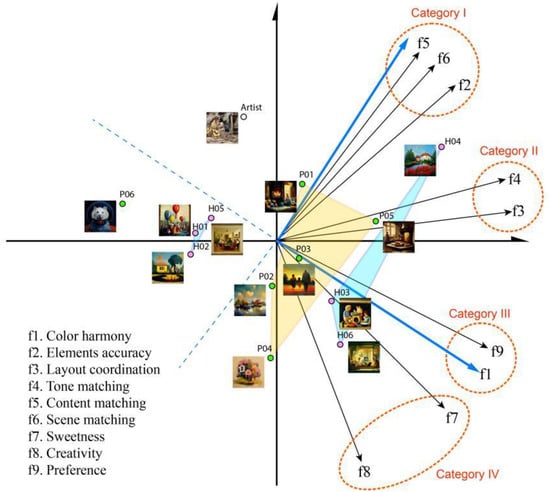 The thirteen paintings were presented in the cognitive space of preferences in the form of point coordinates. The locations of stimulus paintings that were grouped together represented that they had a similar rating, while the locations of stimulus paintings that were separated represented that the paintings held different attributes. Each painting could be projected onto every attribute vector. According to the distribution of paintings in Figure 3, the most generations interacted with by AI and creators with artistic backgrounds (P01–P05) could be projected onto the positive pole of most attribute vectors, whereas P06 was far away from others of the same type and had more negative perceptions. Furthermore, the paintings co-created by AI and nonartists were located in three clusters. H03 and H06 had higher perceptions of high-level attributes, and H04 was better on low-level attributes. In contrast, H01, H02, and H05 gathered and projected onto the negative pole of all the attribute vectors. As for the reference sample, the paintings by artists performed better on semantic matching.