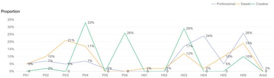 To further determine whether there were perceptual differences among the three types of paintings, in this study, subjects were invited to choose what they considered to be the most professional, sweet, and creative painting. Finally, the work that they thought was most like human paintings was picked. Figure 4 shows the proportion of people selecting the most professional, sweet, and creative painting among all the subjects. As for the professional aspect, the top three paintings were H06 (26%), H04 (24%), and H03 (17%); while considering the sweet aspect, the order was P03 (21%), H06 (19%), and P04 (17%); and in the creativity aspect, the top three were P04 (33%), H03 (29%), and P06 (26%).